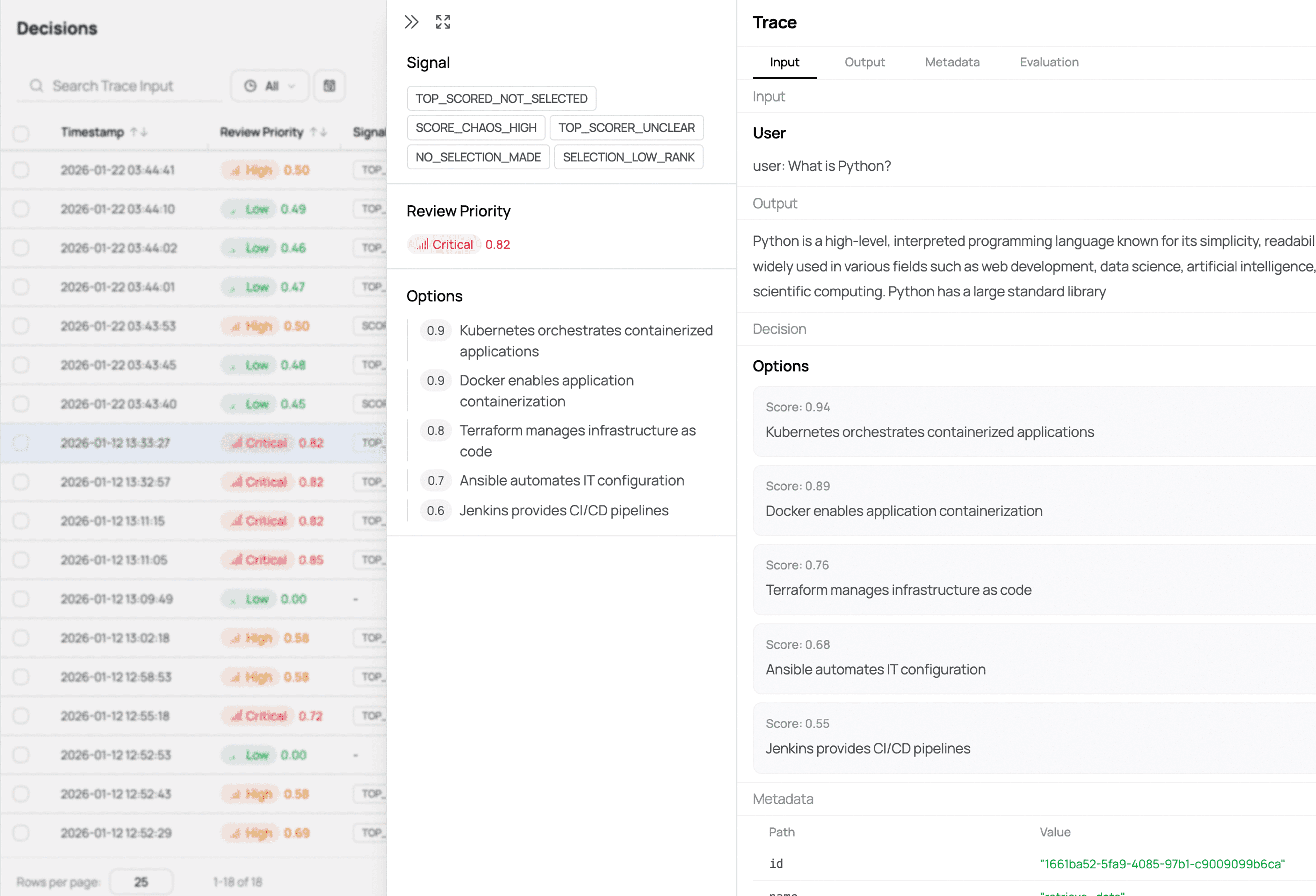 Assess trace outputs and decisions together to identify where errors, uncertainty, or risk were introduced — before they compound into failures.